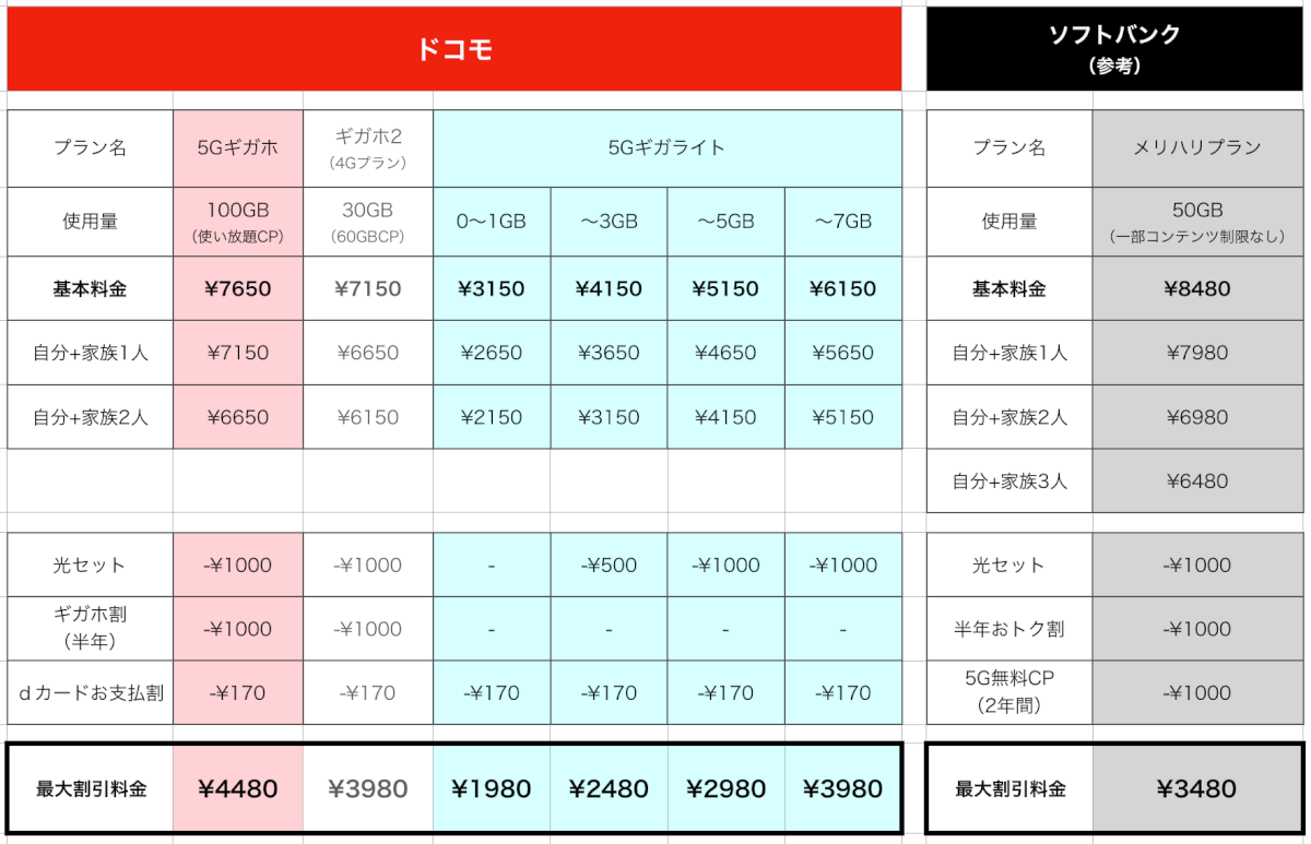 補償や通話パックなどのオプションは書いていません。ややこしいので。一応5Gギガライトも書きましたが、4Gと料金が変わらないので今回は触れません。